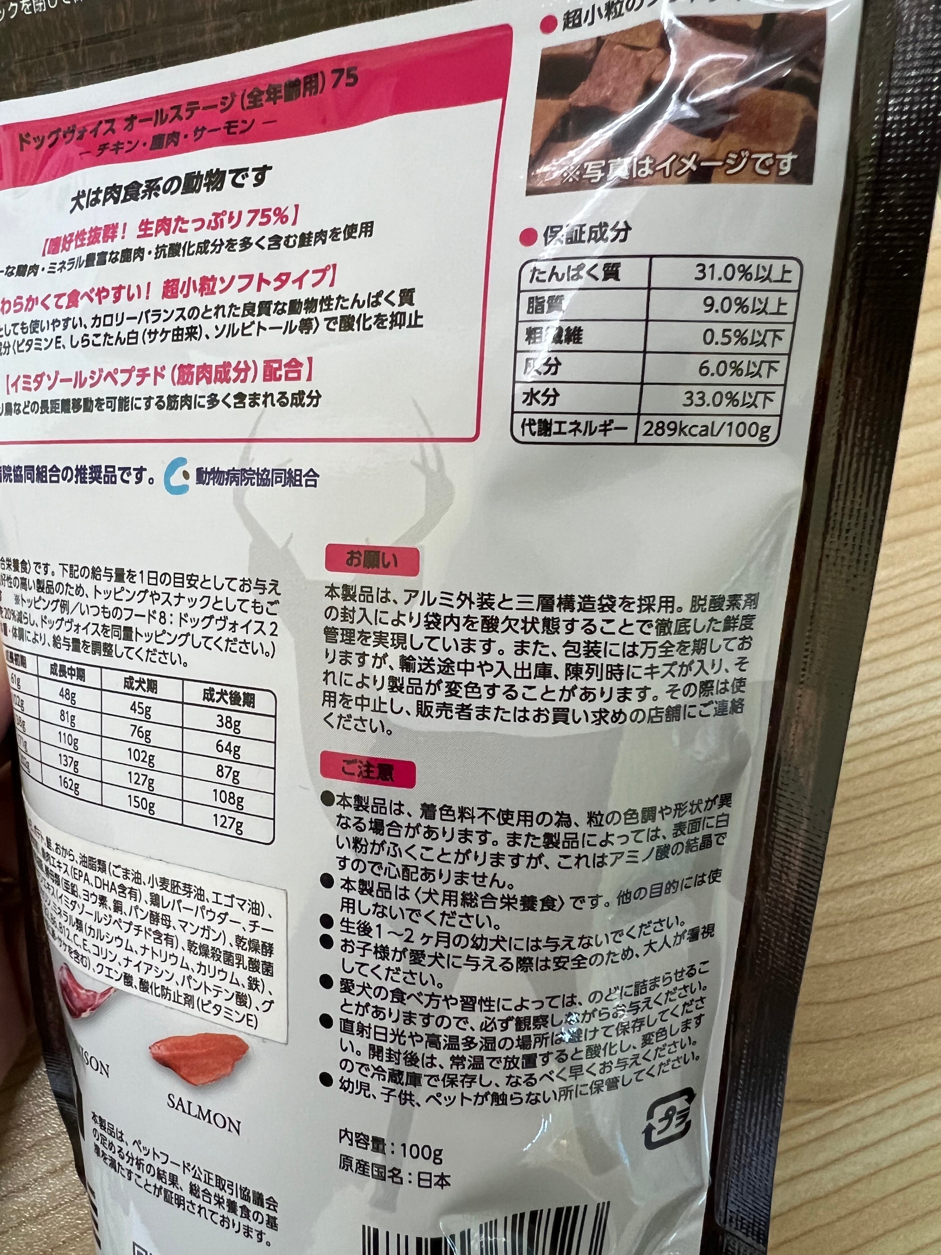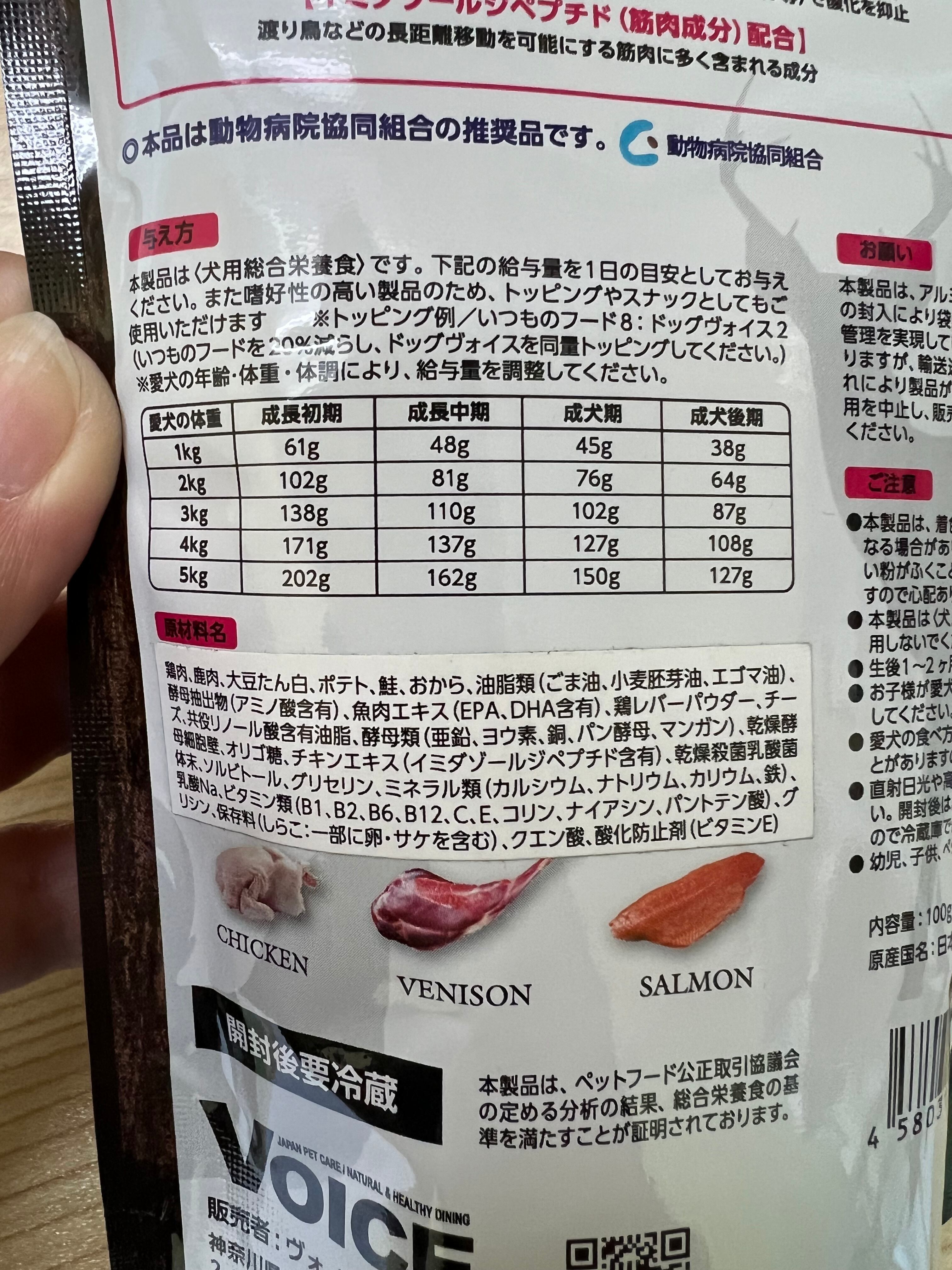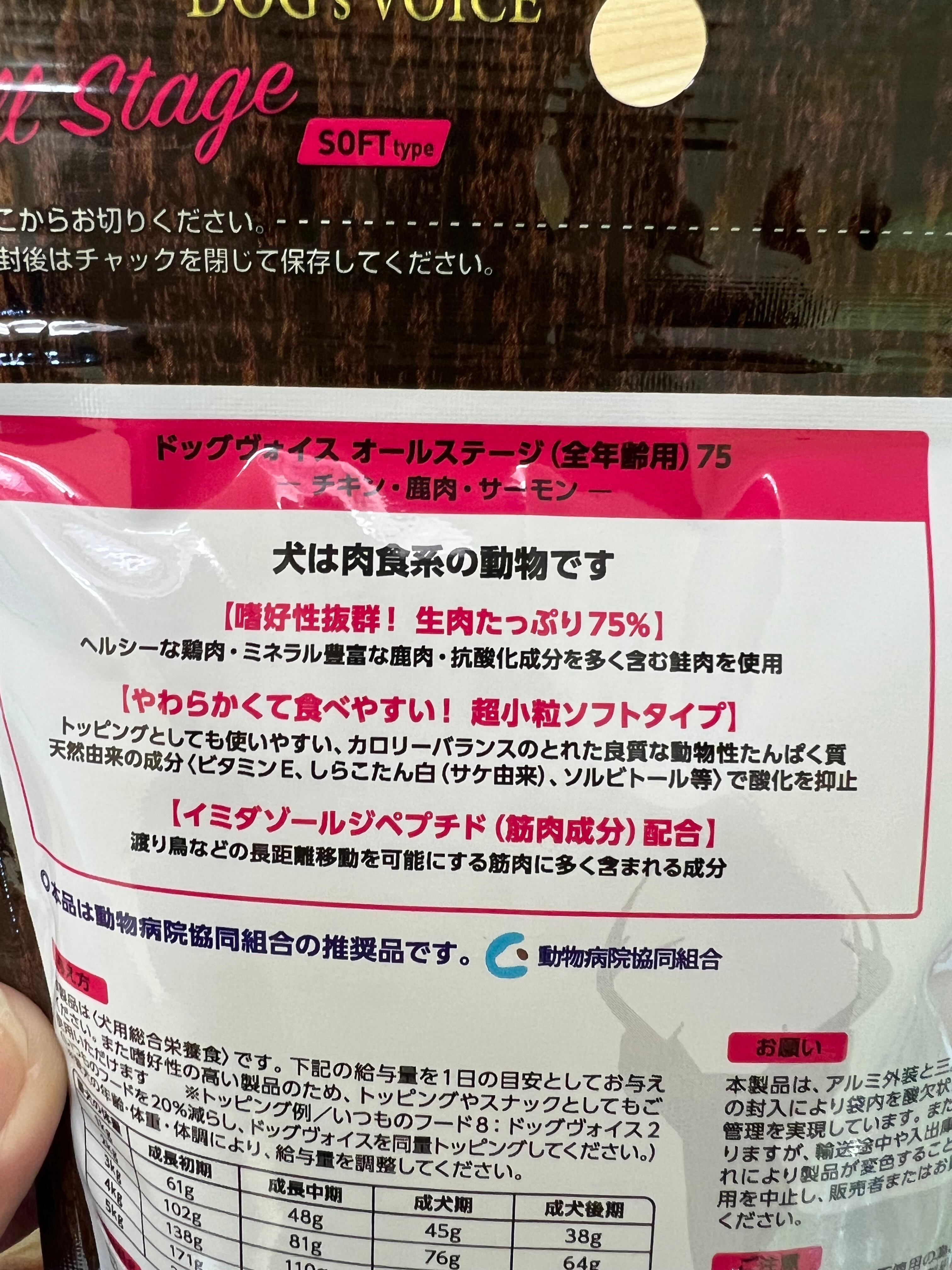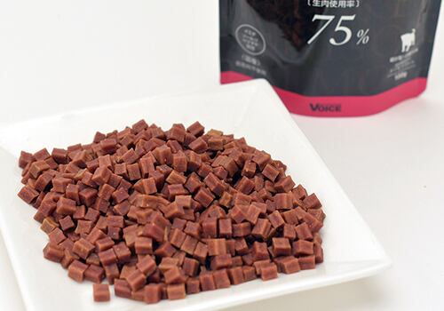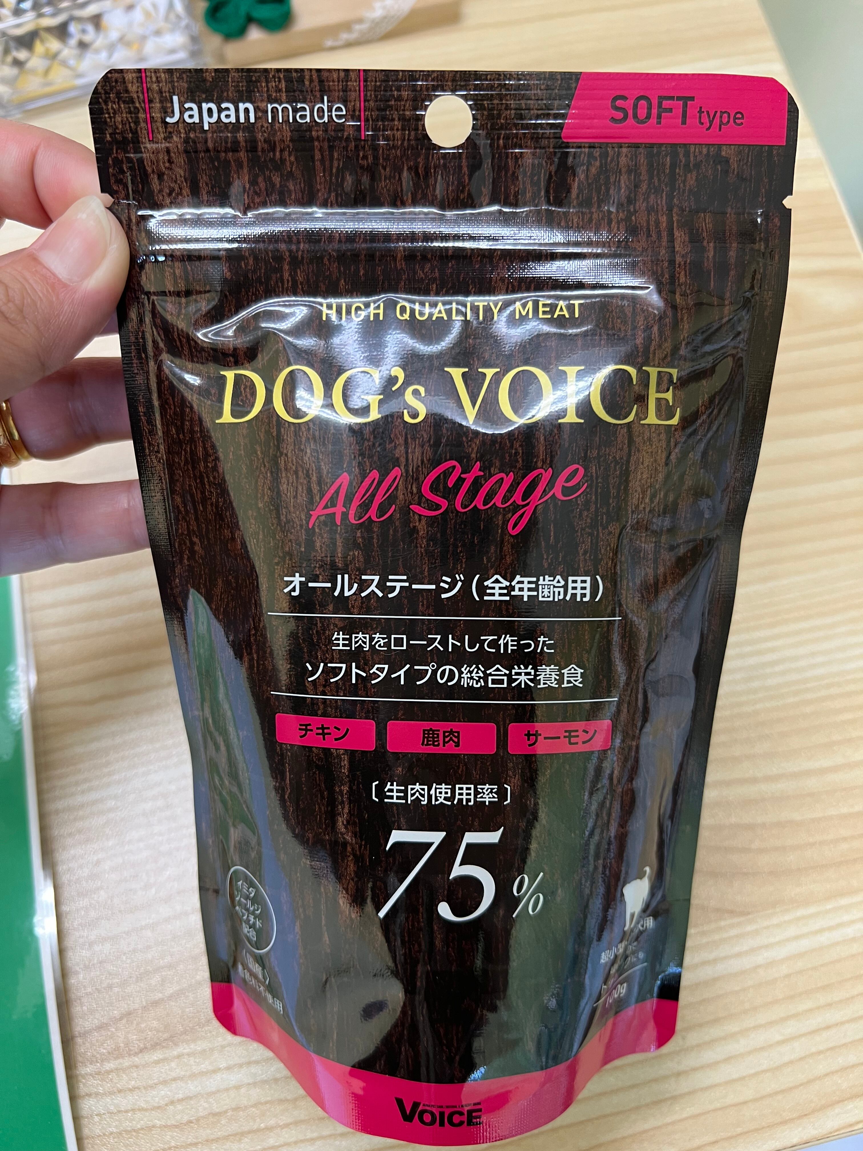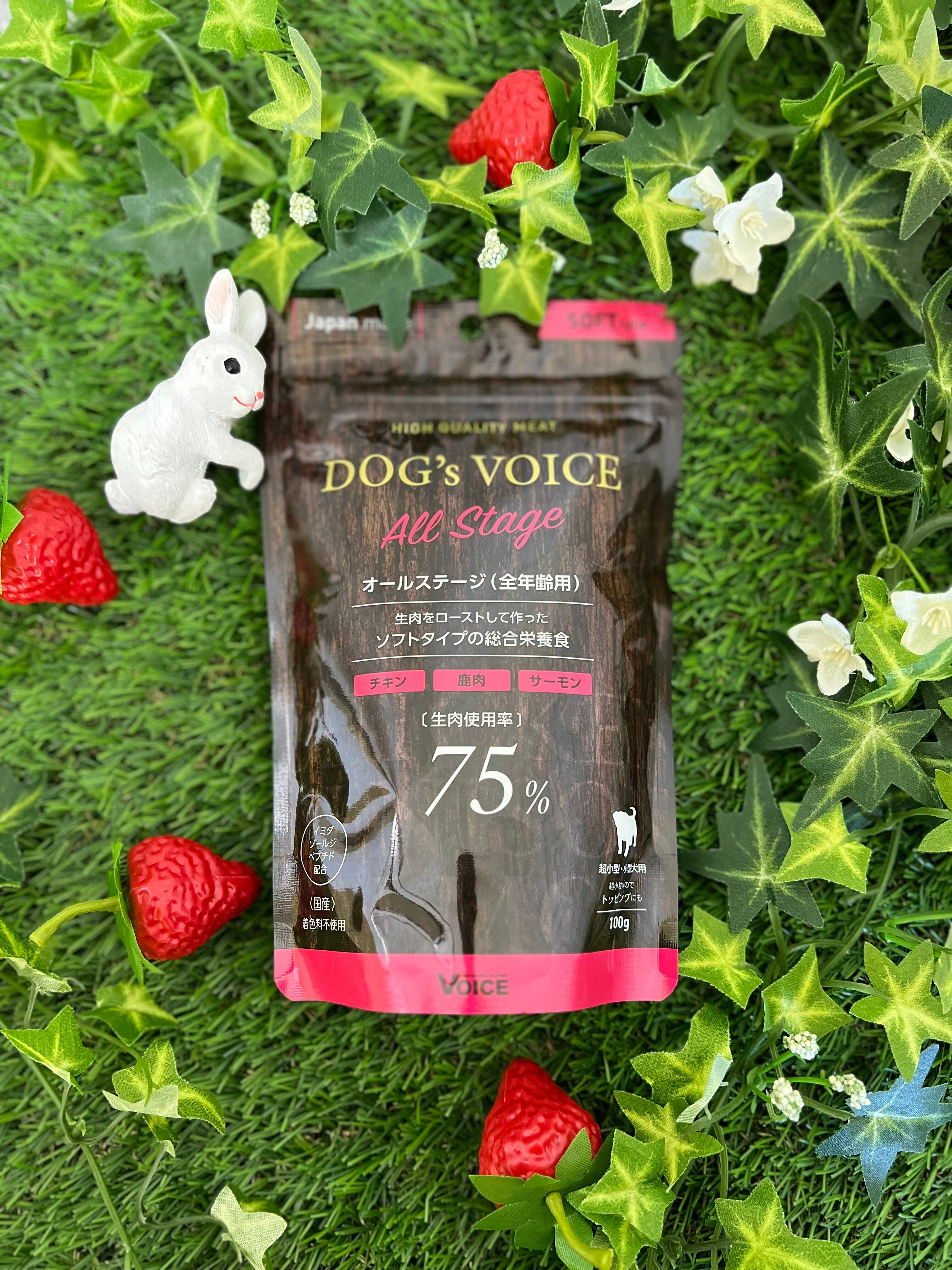 ヴォイス株式会社のドッグヴォイスは、低カロリーな鶏肉をベースに、良質なミネラル(豊富な鉄分)やアミノ酸類を含む鹿肉、抗酸化作用の高いアスタキサンチン、EPA・DHAを多く含む鮭肉を豊富に使用し(生肉の使用量は、オールステージ:75%、シニア:65%、ダイエタリー:55%)、彼らの嗜好を満足させると同時に、強い身体を作るために動物蛋白を主原料に作られた低カロリーで消化吸収のよい総合栄養食です。