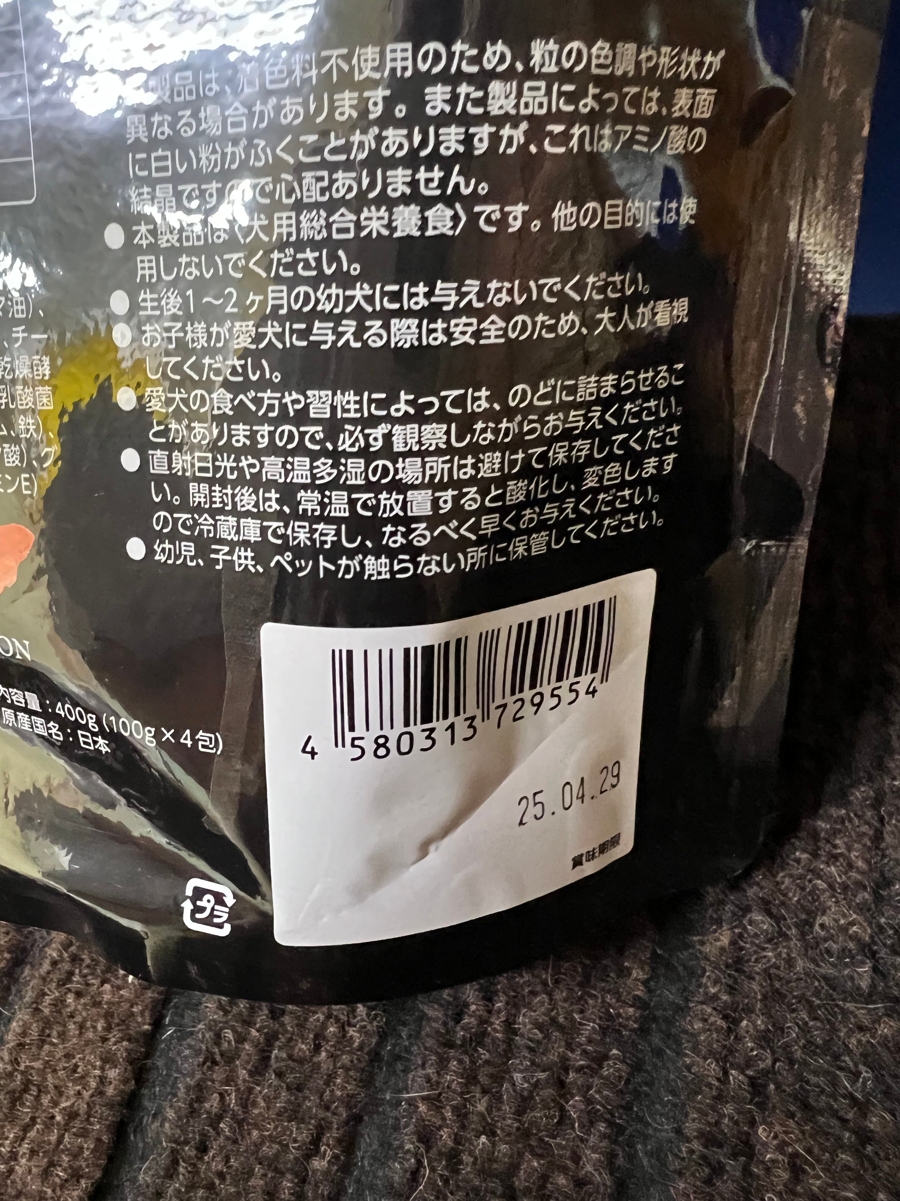 ● 原材料名:鶏肉、鹿肉、大豆たん白、ポテト、鮭、おから、油脂類(ごま油、小麦胚芽油、エゴマ油)、酵母抽出物(アミノ酸含有)、鶏レバーパウダー、チーズ、共役リノール酸含有油脂、酵母類(亜鉛、ヨウ素、銅、マンガン)、乾燥酵母細胞壁、オリゴ糖、チキンエキス(イミダゾールジペプチド含有)、パン酵母(セレン含有)、ソルビトール、グリセリン、ミネラル類(カルシウム、ナトリウム、カリウム、鉄)、乳酸Na、グリシン、保存料(しらこ:一部に卵・サケを含む)、ビタミン類(コリン、B12)、酸化防止剤(ビタミンE)、乾燥殺菌乳酸菌体末